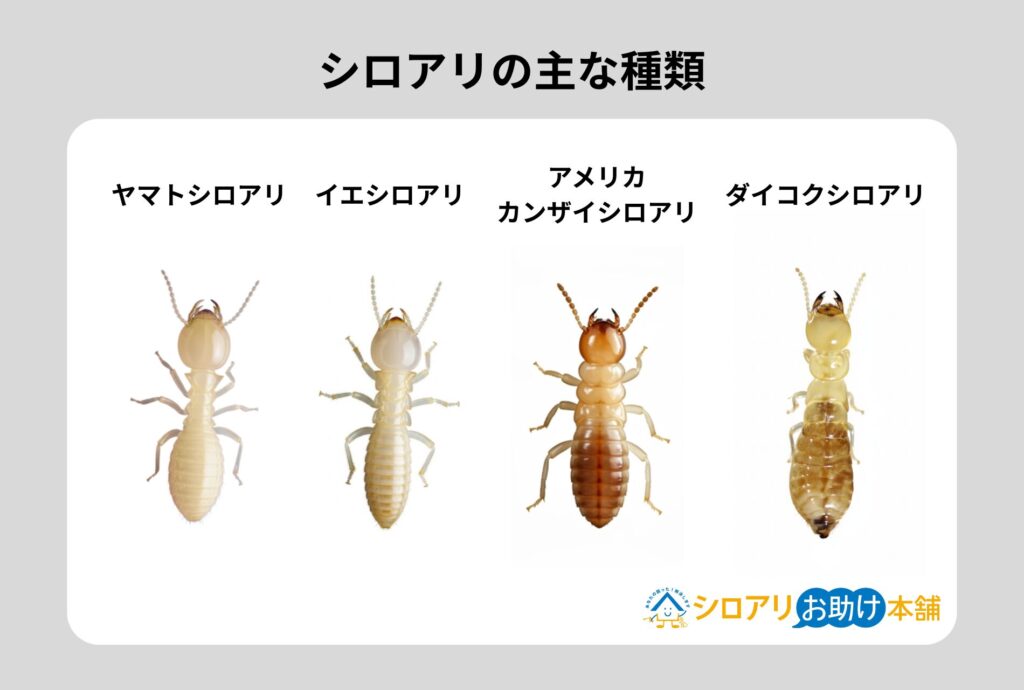 ヤマトシロアリ、イエシロアリ、アメリカカンザイシロアリ、ダイコクシロアリの4種類について、それぞれの羽アリの発生時期や被害を解説します。