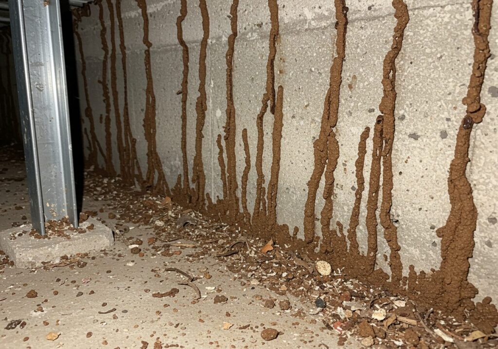 蟻道とは、シロアリが地中から建物内に侵入するためにつくるトンネル状の通路です。主な付着場所として基礎の立ち上がり部分、床下の配管、壁の隙間、ウッドデッキの裏などがあります。