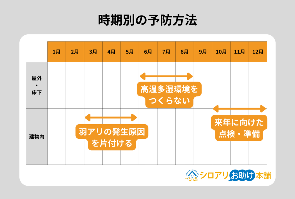 とくに活動が活発になる4〜8月は、羽アリの侵入や蟻道の発生に注意しましょう。羽アリの発生時期や時間帯を把握し、定期的に確認をすることで、早期発見につながります。