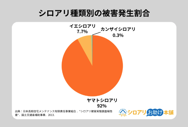 アメリカカンザイシロアリの生息域は限られており、被害件数は多くありません。日本国内では、ダイコクシロアリも含む、カンザイシロアリ全体で0.3%程度です。