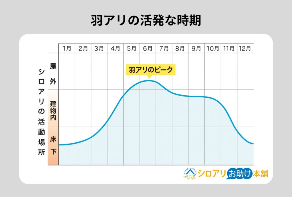 シロアリの働きアリは1年中活動を続ける一方、羽アリは種類ごとに発生時期が決まっています。