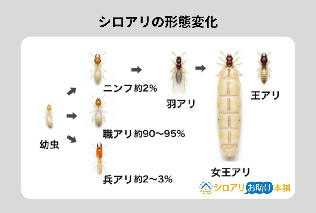 シロアリは真社会性と呼ばれる性質をもち、集団で効率的に生きるために成長の過程で役割に応じた形態に分かれます。