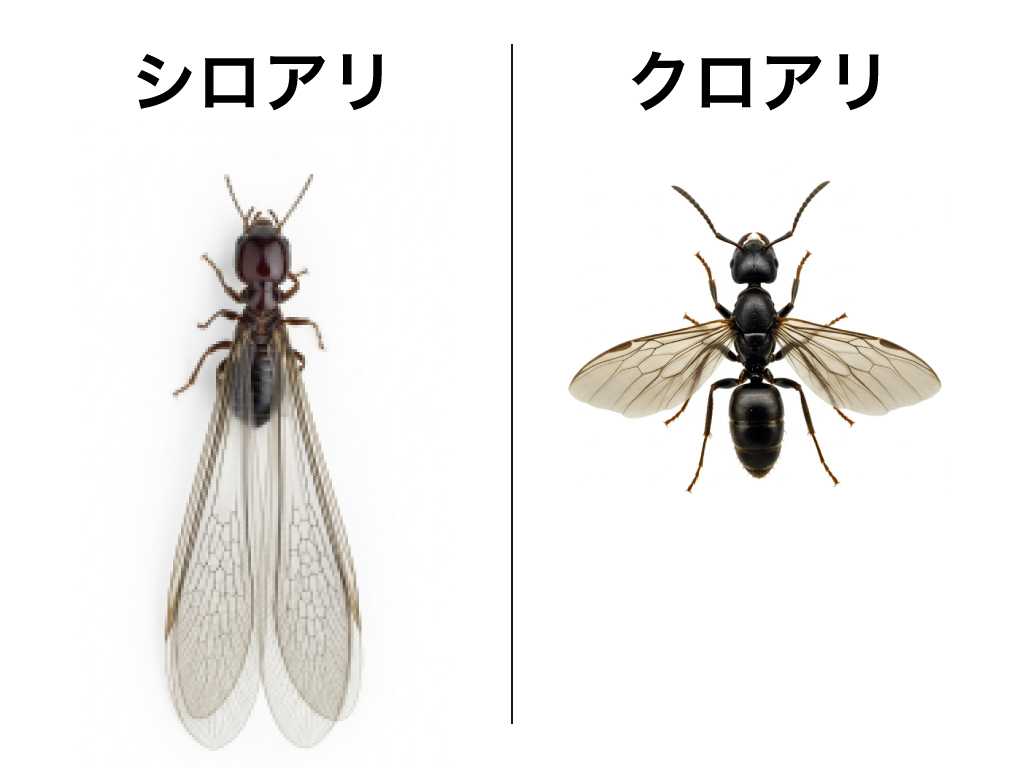 普段目にする白くて羽のないシロアリとは、大きさと羽の有無で明確に判別が可能です。